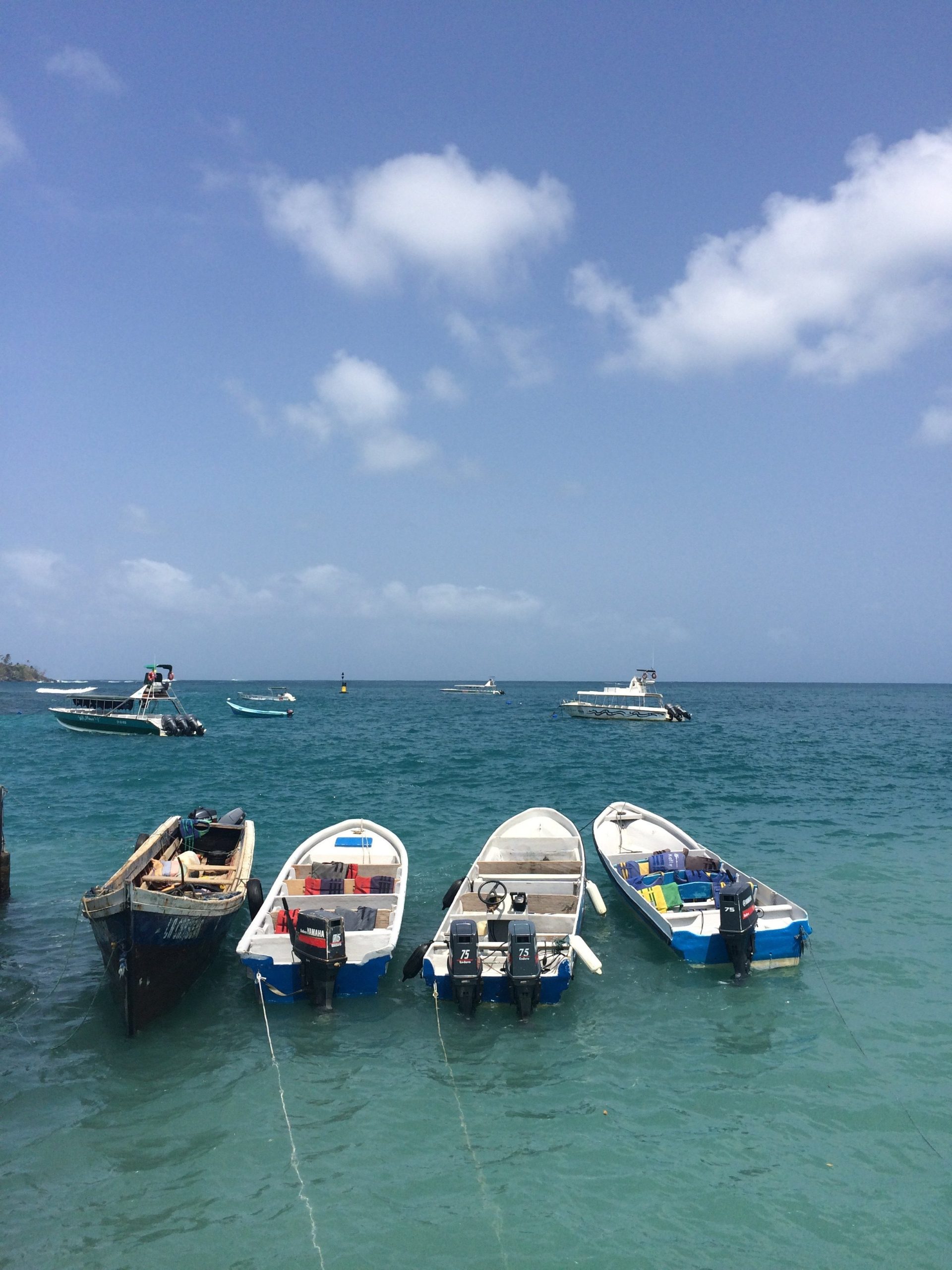 Image of four boats tied up at the shore. Clear blue waters and only two small clouds in the sky